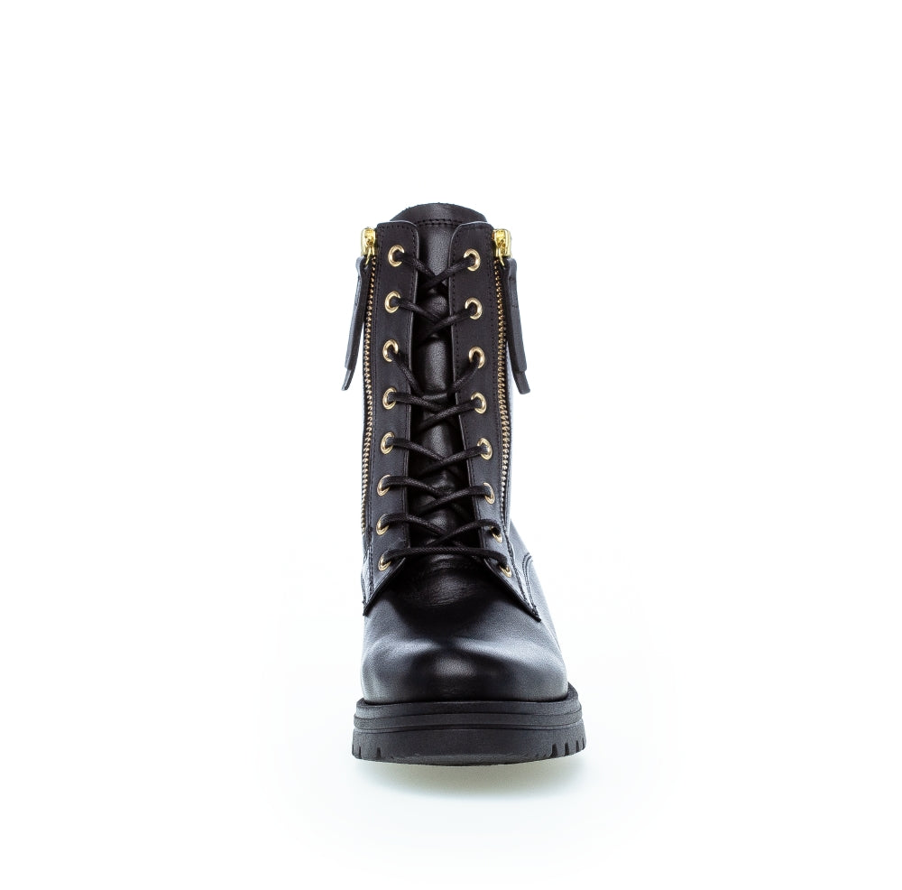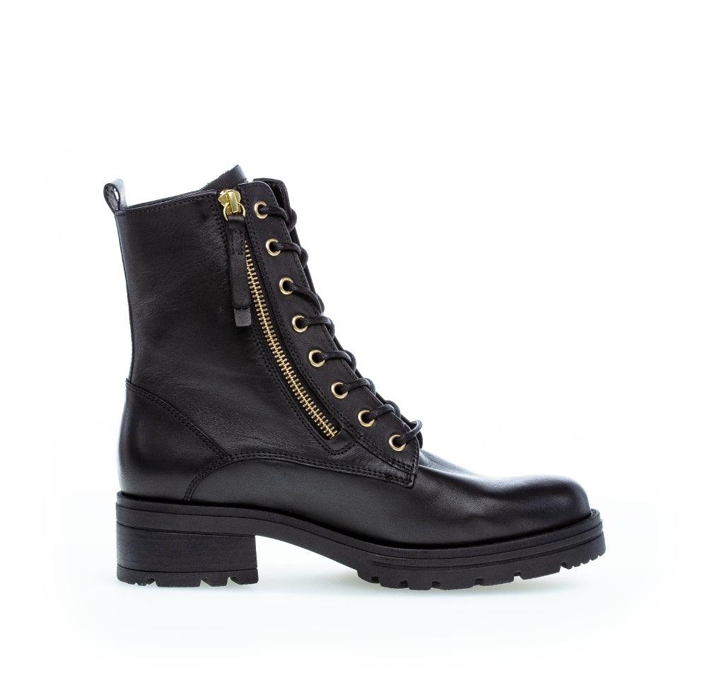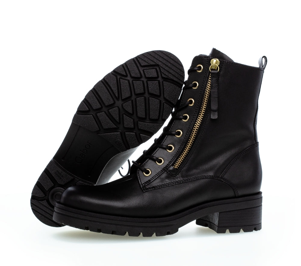 The Gabor Serve are a fashion-forward pair of women's biker boots which feature leather uppers with gold metallic detailing. Zip and lace fastenings allow Serve to be easily secured for a comfortable fit.